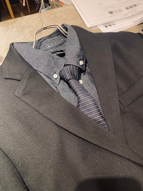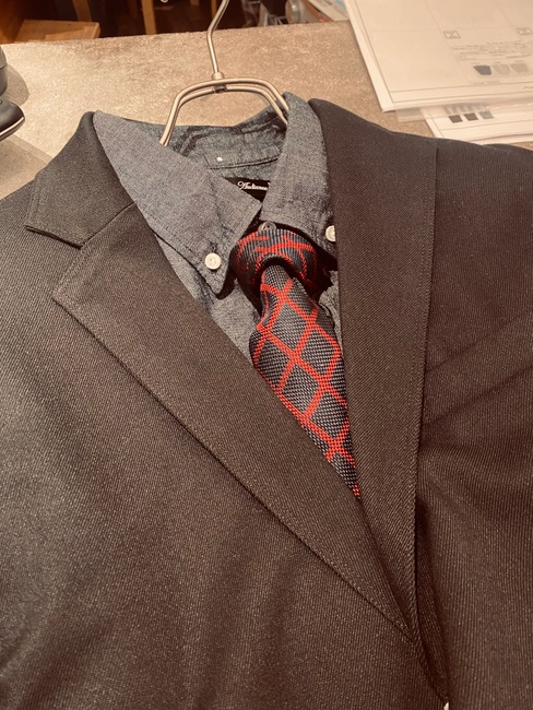 1番らしさがでるのはVゾーンです。ネクタイははずせないぞ、と映像を見て思いました。実は私、アパレルメーカーに勤務してたころに買ったネクタイを大事に今も10~15本くらい持ってるんです(厳選しました)その中から御貸しします!と伝えました。ジャケット&パンツ・セットアップとシャツ、シューズは購入して頂きました。