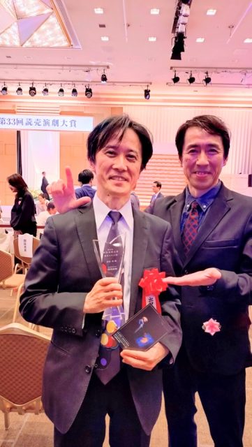 先月末、第33回読売演劇大賞 贈賞式・懇親パーティーにナクールスタイルで出席していただきました。高山さんを長年に渡って支えてきた照明家・岩城保さんが読売演芸大賞の優秀スタッフ賞を受賞したのです。高山さんのチーム劇励のスタッフとして長く尽力しつづけてきた岩城さん。高山さんとは30数年来の盟友でもあるそうです。お二人の仲がよく表れたいい写真ですよね。